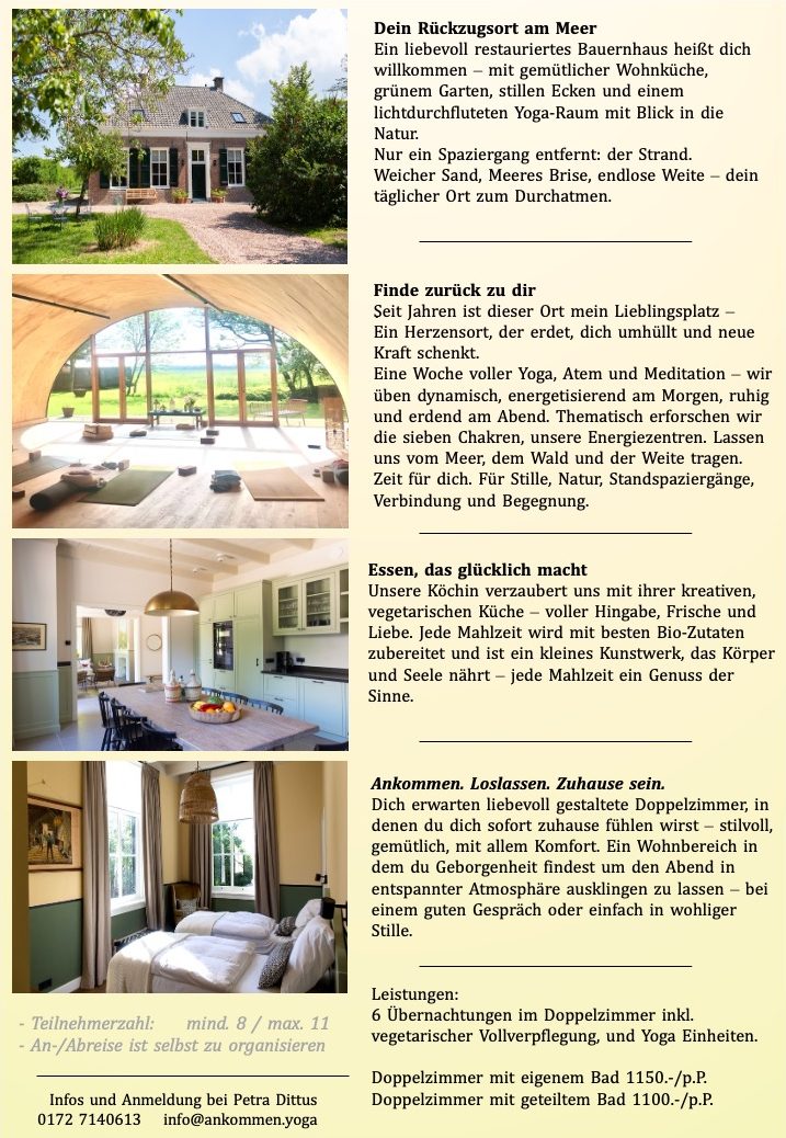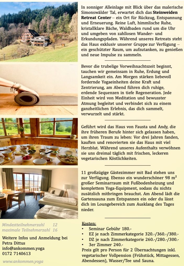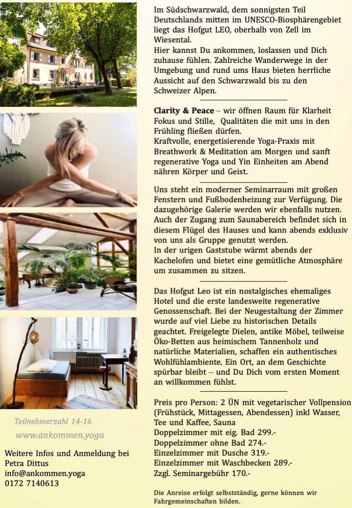 Gönn dir eine Pause vom Alltag. Eine Auszeit kann so vieles sein, Rückzug, tiefe Yogapraxis, inspirierender Austausch und die Möglichkeit wieder bei dir anzukommen. Genau dafür schaffen wir gemeinsam Raum.